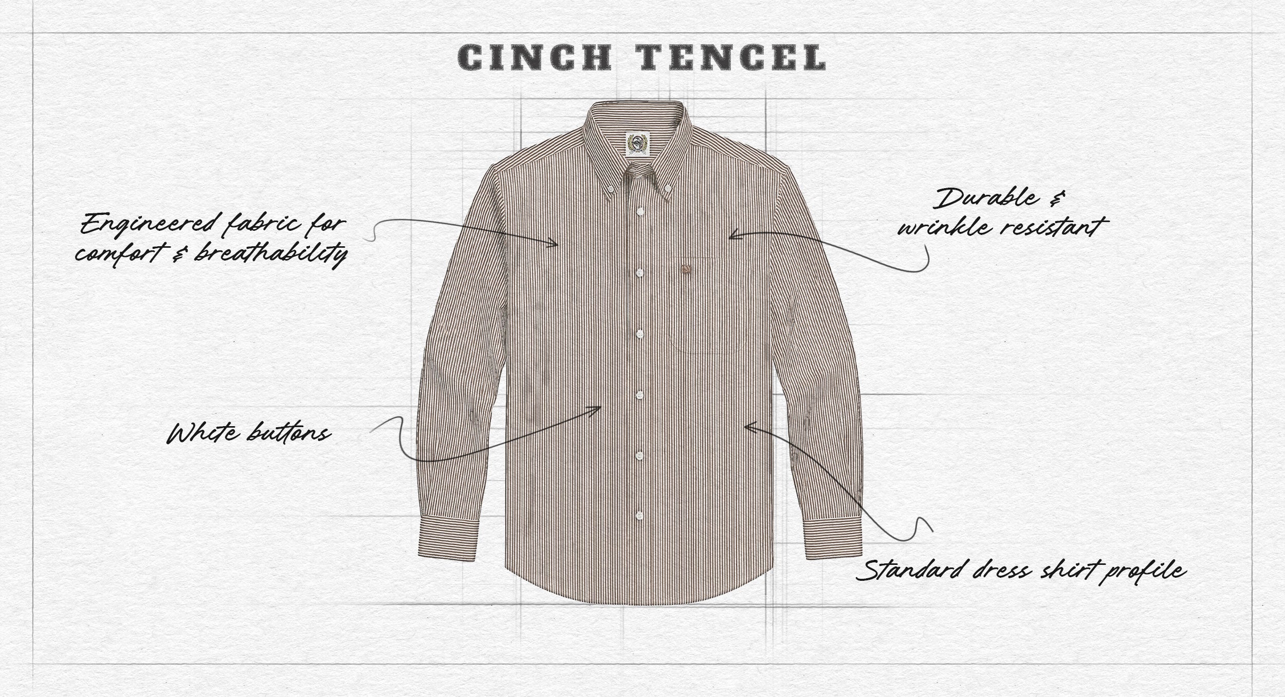 Experience the next generation of performance and comfort with the Cinch Men's TENCEL™ Button-Down Shirt. Crafted from a TENCEL™, cotton, and polyester blend, this yarn-dyed stripe shirt is softer, stronger, and cooler than cotton, offering breathability, moisture-wicking, and long-lasting color vibrancy. Thoughtful details like white logo buttons, an embroidered logo, and neck tape add a refined touch, making it the perfect blend of modern performance and classic Western style—ideal for long days on the ranch or a night out.